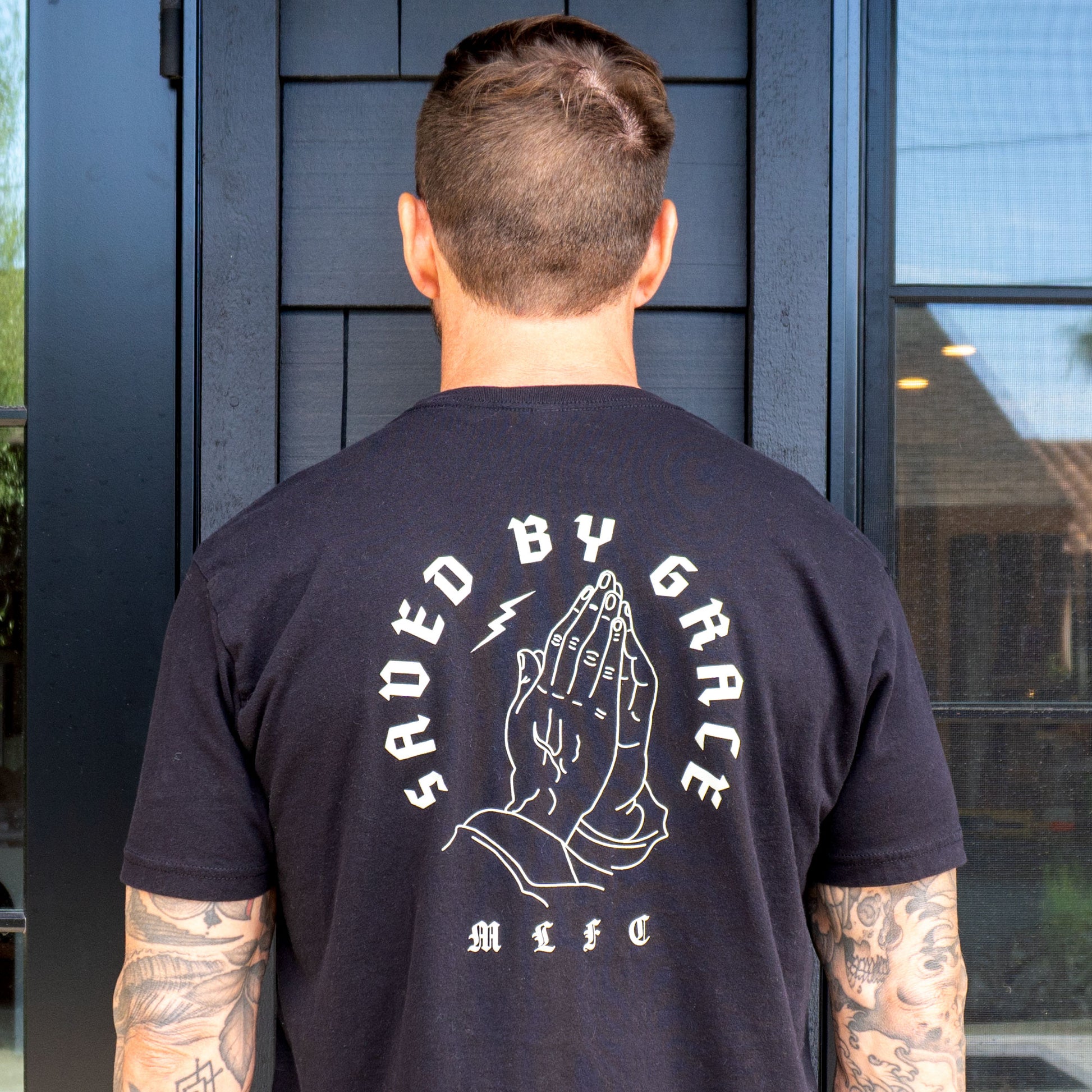 Invest in quality and style with our Saved By Grace T-Shirt with Front Flip The Switch Pocket Design & Back Praying Hands Design, designed by Jeff Sutherland.